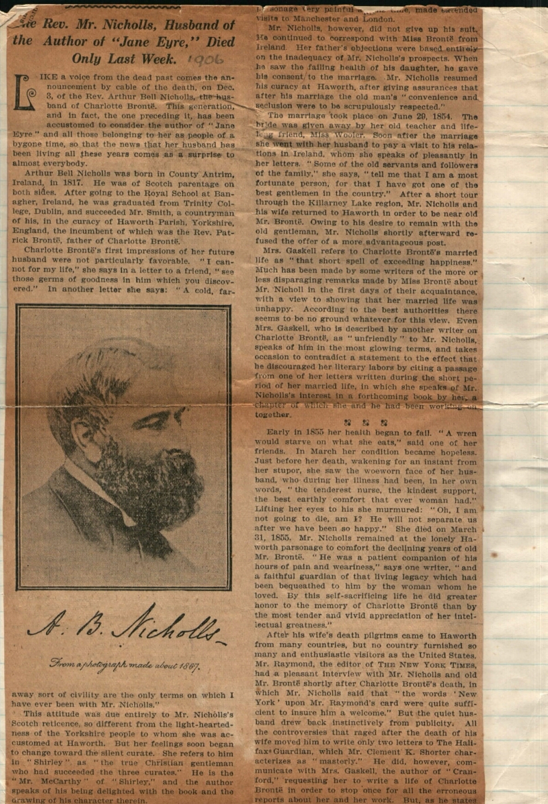 This article was a random find in one of the many used bookstores of Hay-On-Wye, Wales. The first book I spotted in the store just happened to be Clement Shorter's Charlotte Bronte and Her Circle. Opening up the front cover, what falls out but a piece of paper, folded up! So, as any curious person would, I opened it, only to find this article. Unfortunately, the person who clipped it did not clip all of it, but something is better than nothing!